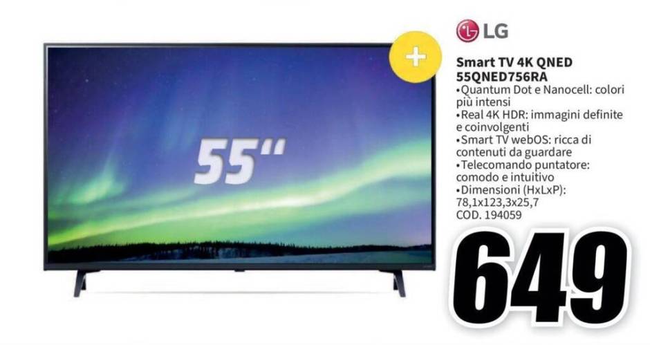 Schermo: Ampiezza spettro colore QNED Color; Local dimming. Video: Filmmaker Mode; Codec HEVC (TV / USB / Streaming) 4K@60p, 10bit. Audio: Sistema diffusori 2.0 canali; Codec audio supportati: AC4, AC3 (Dolby Digital), EAC3, HE-AAC, AAC, MP2, MP3, PCM, WMA, apt-X; Connessioni wireless: Wi-Fi 5 (802.11 ac); Bluetooth 5.0. Smart Tv: Piattaforma webOS 23; Servizi streaming video: Netflix, NOW, Prime video, YouTube, RaiPlay, DAZN, Disney+, Rakuten TV, Apple TV; LG ThinQ – Amazon Alexa – Airplay2; QMS (Quick Media Switching).; Casse: Sì; Subwoofer integrato: No