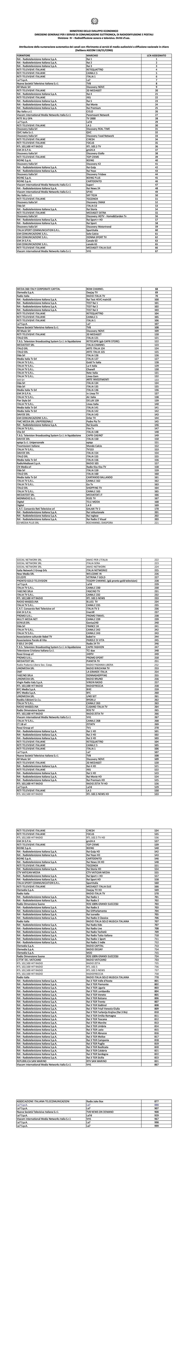 Pubblicato l’atteso esito della procedura per le attribuzioni LCN nazionali, cioè le numerazioni automatiche dei canali sul telecomando con riferimento ai servizi di media audiovisivi a diffusione nazionale in chiaro.
